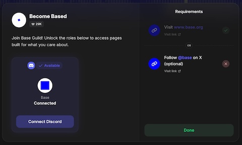 以太坊上最流行的公會應用為 guild.xyz,多數公會都是以它搭建,比如 Uniswap、Hey.xyz 等,假如你曾經在 guild.xyz 加入過其他公會,可以跳過以下的第一步,直接加入 Base 公會。