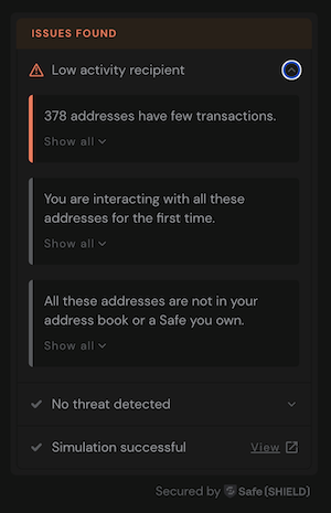 雖然帶麻瓜上鏈是好人好事,但從以前就常做這種傻事的我,錢包已不只一次被人判定為高危。當演算法覺得你像騙子,你只能百辭莫辯;這個世界往往懲罰好人,平生不作虧心事是廢話,君子不立危牆之下才可走得更遠。 - 用任何工具都可以從新錢包地址空投,選用 Safe Wallet 是考慮到它可靠、免費,而且我比較熟悉。雖然讓 AI 寫個小工具也許更快更簡單,但牽涉真金白錢的交易,我寧可麻煩少許,都不想使用沒有安全審計又未經考驗的工具。