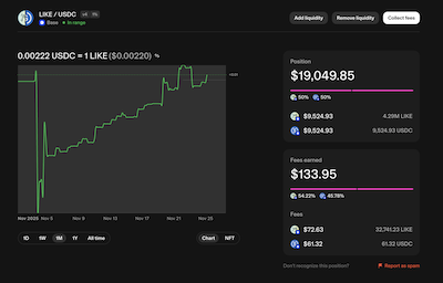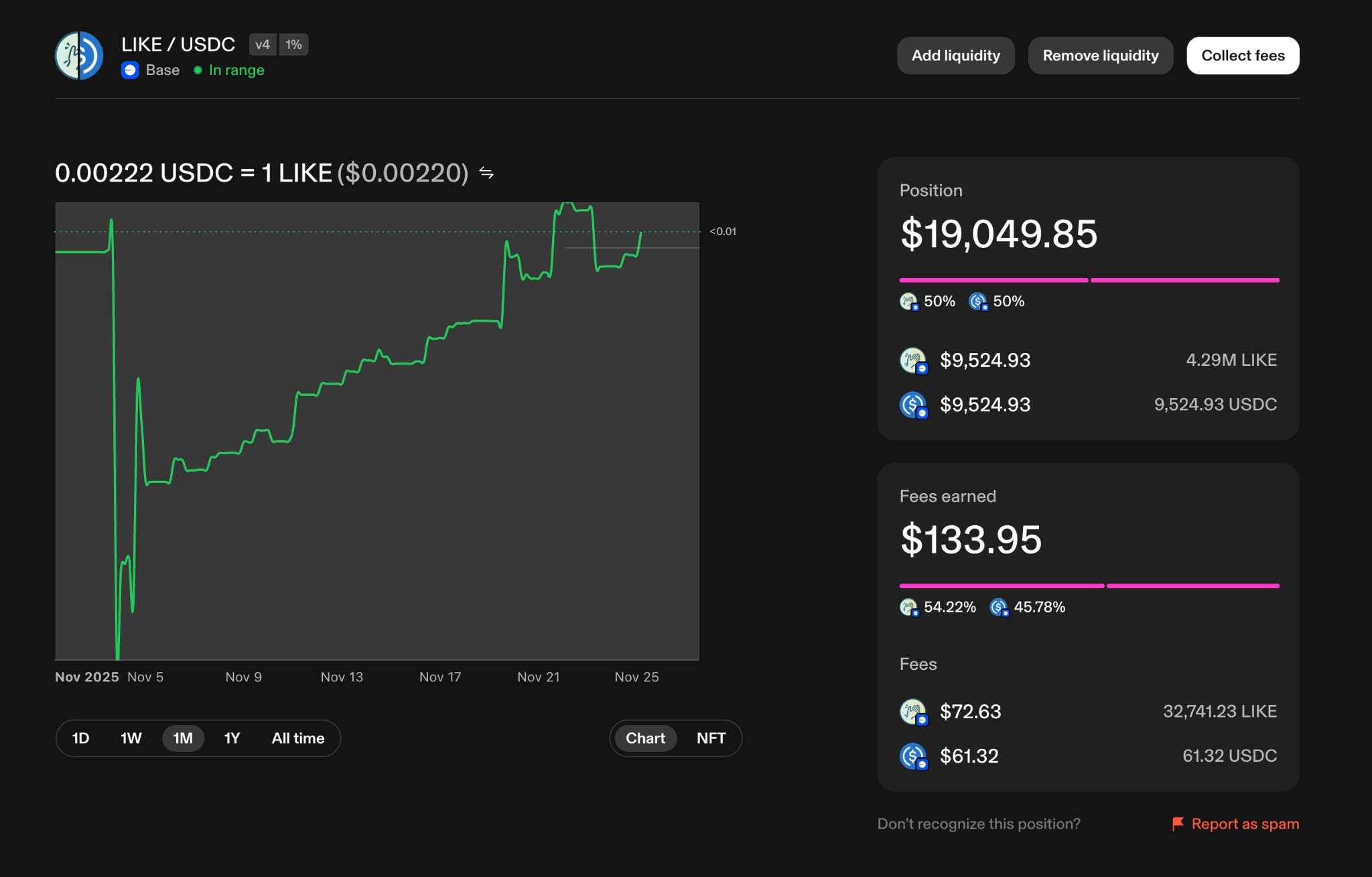 懊惱之際,想起我在 v3 升級前存了近二萬鎂的 LIKE/USDC 到 Uniswap 流動性池,於是領出當中的九分一應付,也順便提領了這陣子賺的手續費 133.95 鎂。粗略一算,年化回報約 11% 多,比我預期高了不少。